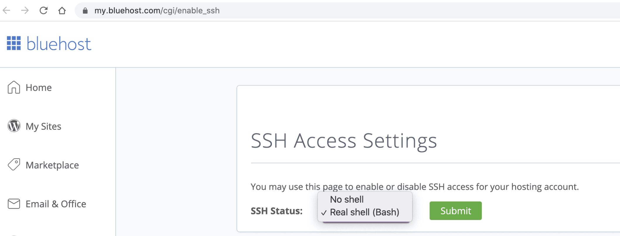 Note: SSH access may not be enabled for you on Bluehost. You can check if it is enabled from your Bluehost account here.