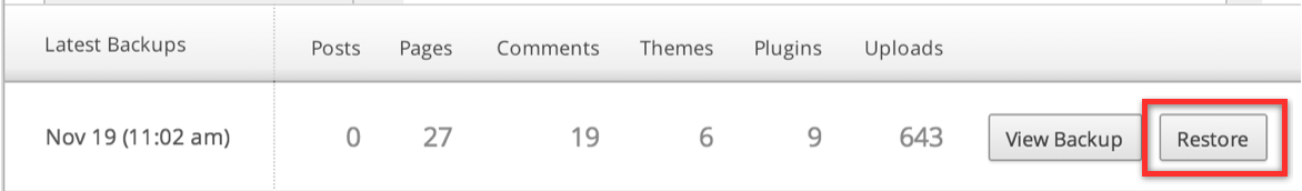 - Click the Restore button, and watch the progress bar as the backup is restored to your new site. Feel free to take a break or navigate away from the page — the restore will continue to run. We’ll even send you an email once it’s finished.
